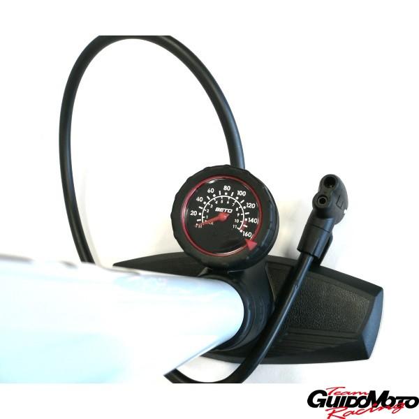 Pompa con raccordo a doppia entrata universale per tutte le valvole, piedistallo a due piedi e manometro di controllo pressione..
