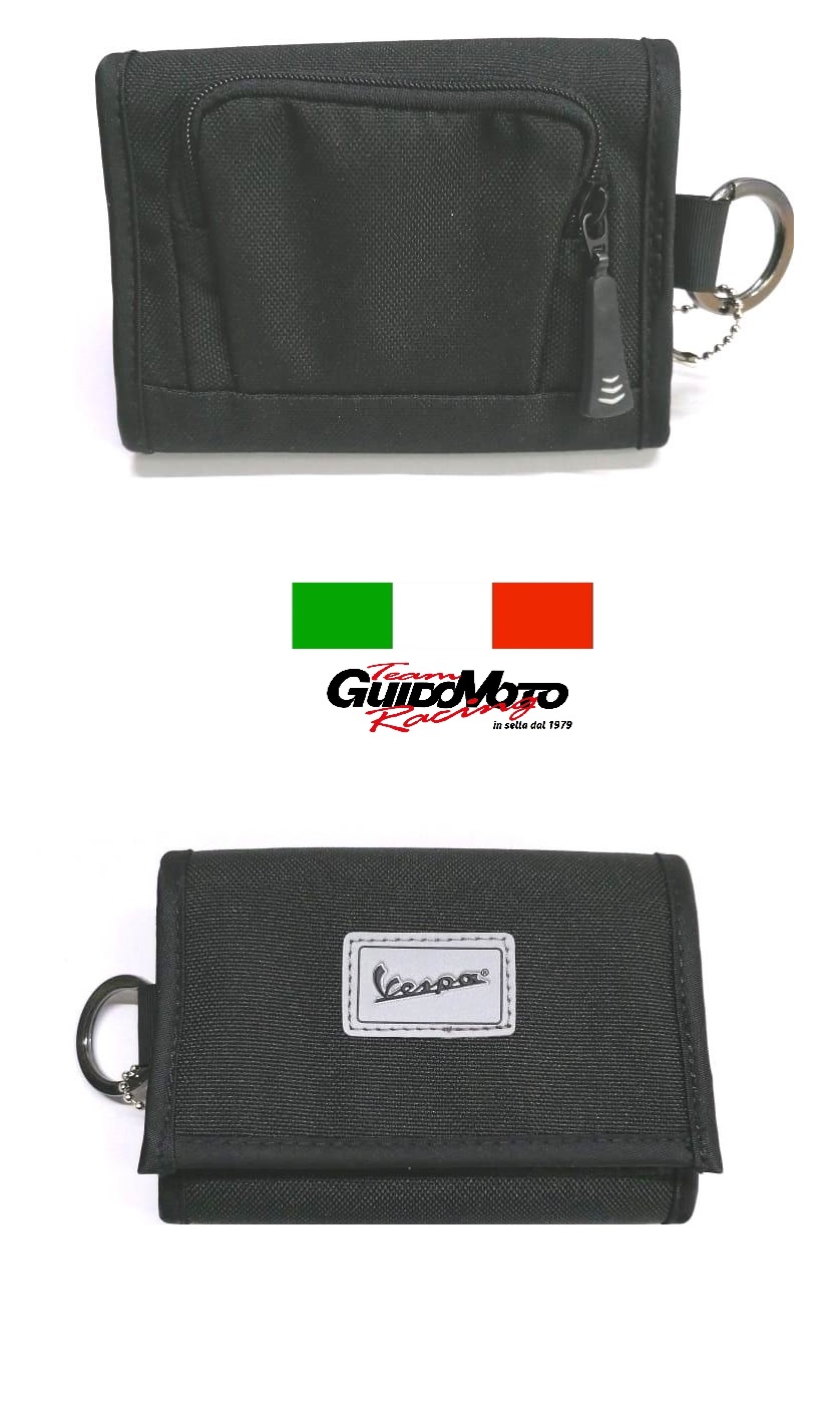 Portafoglio in stoffa blu scuro e scritta Vespa cucita su sfondo grigio